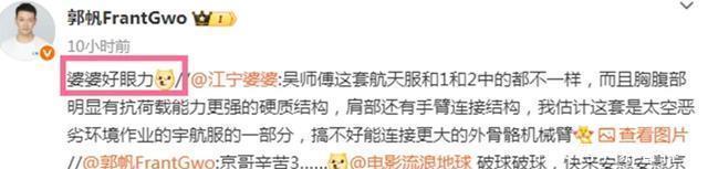 相较于案牍的真谛性,吴京曝光的这套宇航服造型则蕴含着更为塌实的科幻细节。 博主“江宁婆婆”明察其奸地指出:“吴师父这套航天服和1和2中的王人不通常,况且胸腹部光显有抗载荷才调更强的硬质结构,肩部还有手臂纠合结构,我想到这套是天际恶劣环境功课的宇航服的一部分,搞不好能纠合更大的外骨骼机械臂。” 这一专科分析取得了郭帆导演的躬行认证:“婆婆好目力”。