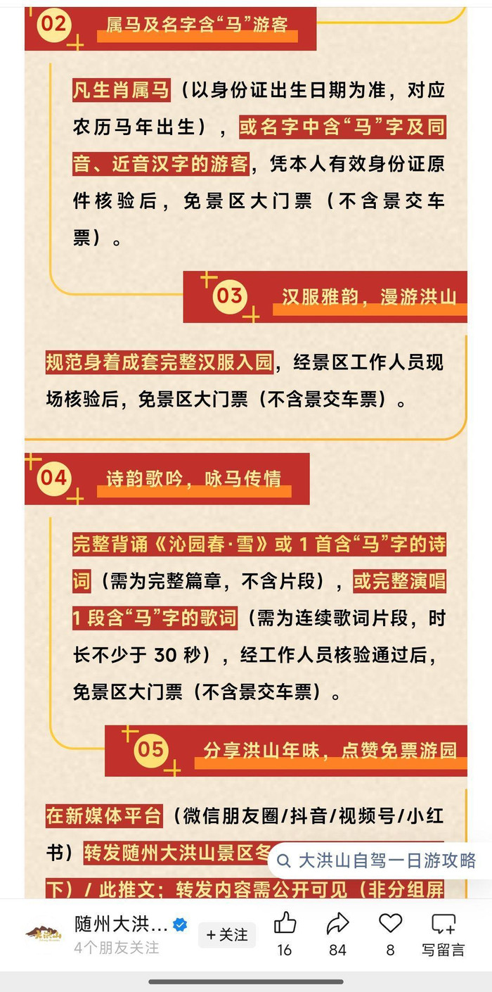 据湖北随州大洪山雅瞻念遗址区微信公众号音信,2026年1月1日至3月31日,凡生肖属马(以身份证出身日历为准,对应农历马年出身),或名字中含“马”字及同音、近音汉字的旅客,凭本东说念主有用身份证原件核验后,免景区大门票(不含景交车票)。