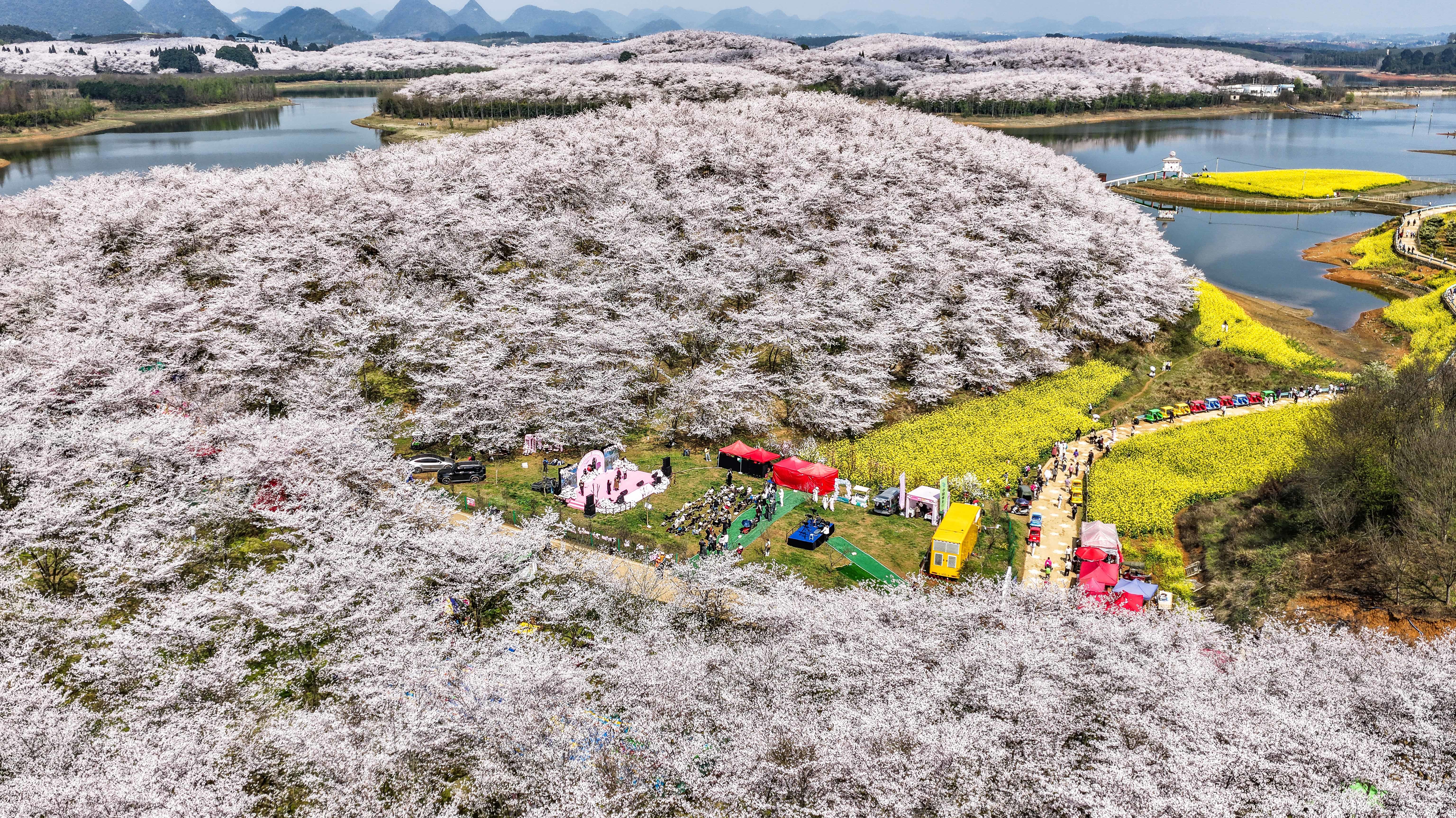 近日,跟着气温回升,贵州省贵安新区樱花坛内的2.4万亩樱花迎来盛花期。如云似霞的樱花和山川、湖泊、民居组成一幅幅美丽的春日画卷,蛊惑广大旅客前来不雅光游玩。