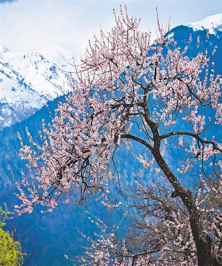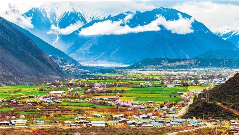 4月2日,米林市扎西绕登乡萨玉村,桃花与雪山交相照映。朱泽辉摄(中经视觉)