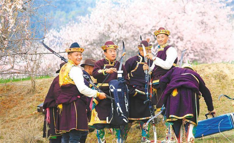 4月3日,林芝市巴宜区布久乡朵当村桃花圃里,村民们盛装打扮为“毕秀”(工布响箭)饰演作念准备。 谢筱纯摄(中经视觉)