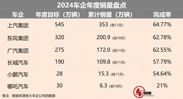 凭据圈哥当今所征集、整理的数据,上汽集团明显是一众无法完成2024年度销量指所在国内车企中首当其冲者。本年1-11月,该集团累计销量为353万辆——与年头成立的545万辆之年度指标比拟,达成率仅为64.77%,明显已不能能“圆满收官”。
