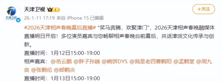 每一年过年的时辰,皆是各大卫视举办春晚的时辰。这如故是天津卫视相连许多年举办相声春晚了。而2026年,天津卫视依然挂出了“相声春晚”的牌子,而主力军依然是德云社的相声演员。天津卫视发布了一则博文,实质是参演相声春晚的演员进行直播。这其中就包括来自德云社的岳云鹏、孙越、郭德纲、于谦、烧饼、曹鹤阳、孟鹤堂、周九良、张鹤伦、郎鹤炎、栾云平、孔云龙、张鹤擎、王九龙、张九南等东谈主。这些东谈主应该是投入相声春晚的主要演员。