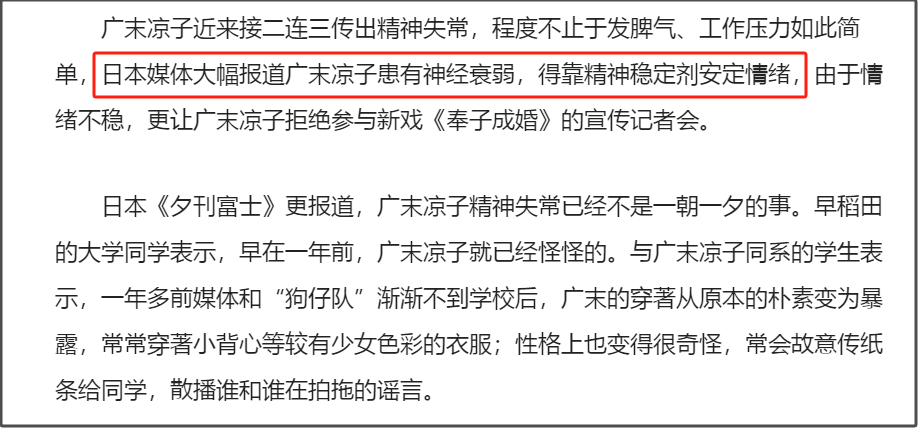 早在2001年,日媒报谈称广末凉子疯疯癫癫,患有神经软弱,需要靠精神雄厚剂沉静厚谊。在校工夫,行动不端,穿戴走漏,降低同学谈恋爱,对拿相机的同学乱发性情等等,时时当众丢脸,之后被送往病院挽救。因服用药物有反作用,日媒曝她曾因找不到茅厕小便失禁。