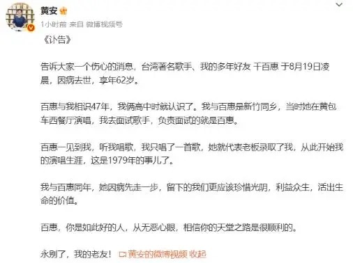8月20日,黄安发文称,驰名歌手、其多年好友千百惠于8月19日凌晨,因病升天,享年62岁。