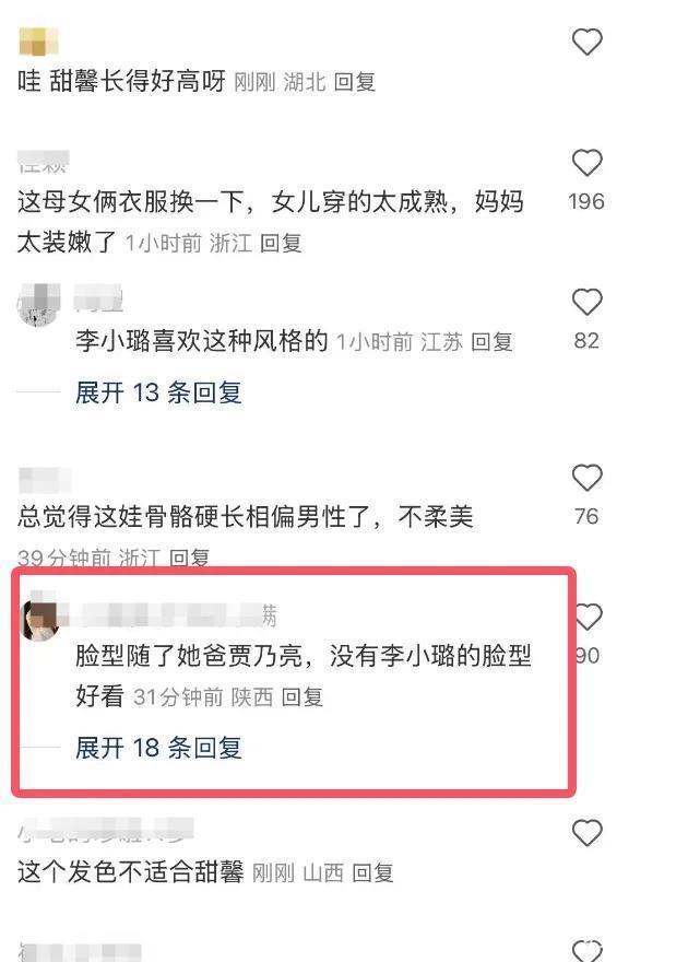 甜馨才13岁,然而气场全开,她的五官倒不是很像李小璐,倒是像女版的“贾乃亮”相似,和她爸爸的相似度很高。