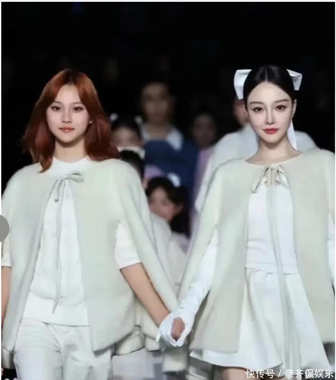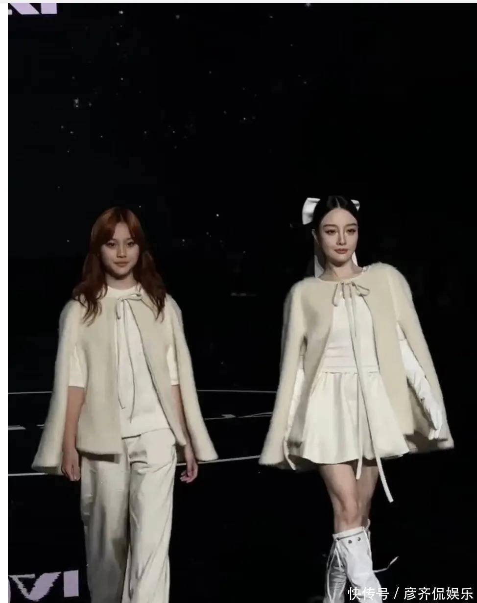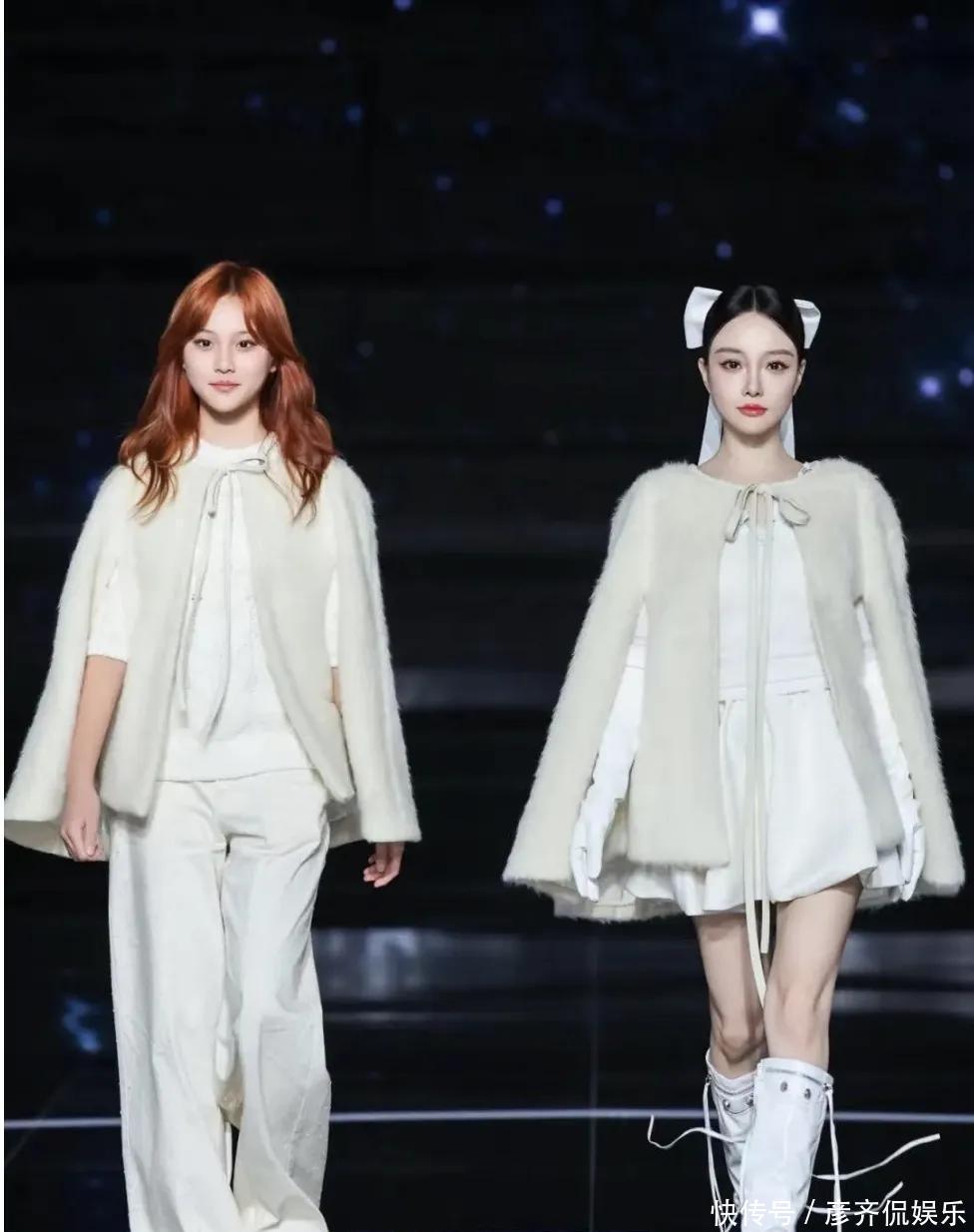 董璇和小酒窝一皆走秀,两东谈主都衣着米白色的羊毛大衣,搭配白色的蕾丝裙子,董璇的现象也曾很可以的。