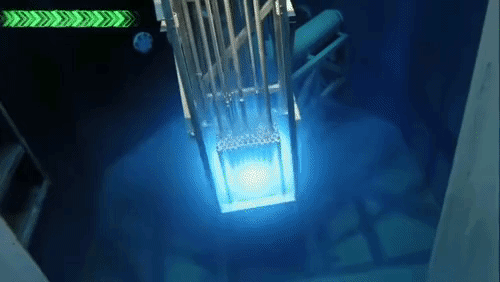 虽然了,这肉眼可见的蓝光其实并不是咱们平方所说的核发射(α、β和γ射线),而是一种短波电磁发射,也叫作念切伦科夫发射,是物体在介质中以超光速(仅仅跳跃光在该介质中的速率,并不是跳跃真空光速)征战时发出的,典型特征即是这种充满科幻感的蓝色光辉。