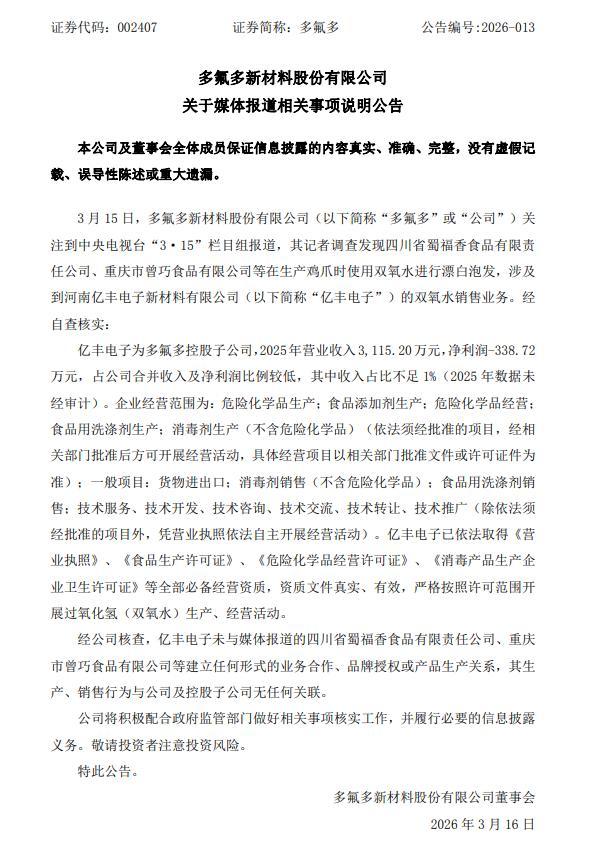 3月16日,多氟多(002407.SZ)发布对于媒体报谈有关事项讲解公告,公司温雅到中央电视台“3·15”栏目组报谈,其记者拜访发现四川省蜀福香食物有限株连公司、重庆市曾巧食物有限公司等在出产鸡爪时使用双氧水进行漂白泡发,触及到河南亿丰电子新材料有限公司(简称“亿丰电子”)的双氧水销售业务。
