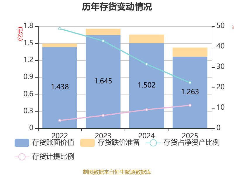 从存货变动来看,摒弃2025年末,公司存货账面价值为1.26亿元,占净钞票的22.36%,较上年末减少2385.2万元。其中,存货跌价准备为1606.06万元,计提比例为11.28%。