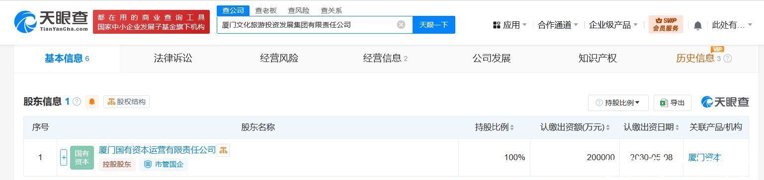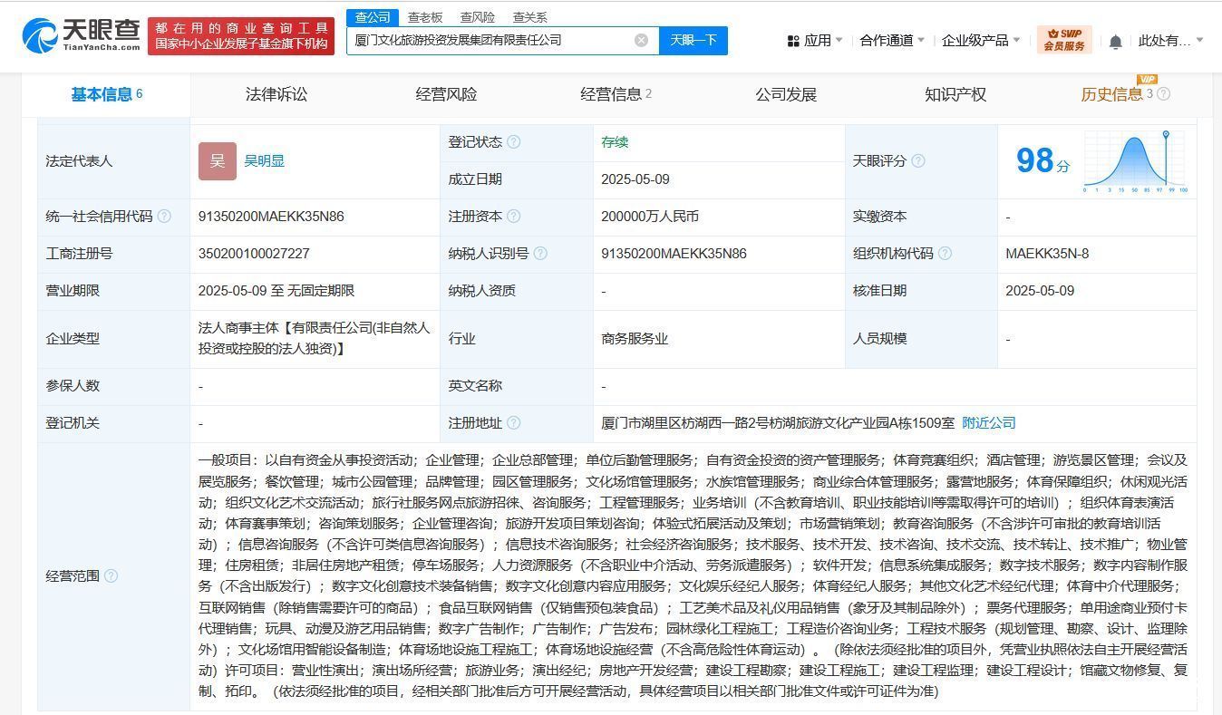 天眼查App泄露,近日,厦门文化旅游投资发展集团有限包袱公司建造,法定代表东谈主为吴彰着,注册本钱20亿东谈主民币,计较畛域含以自有资金从事投资作为、企业处置、企业总部处置、自有资金投资的金钱处置功绩、体育竞赛组织、组织文化艺术相似作为等。鼓舞信息泄露,该公司由厦门国有本钱运营有限包袱公司全资握股。