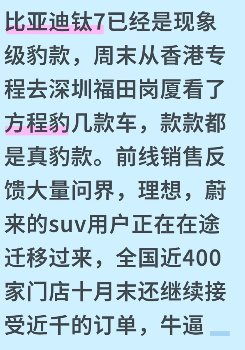 当香港用户专程奔赴深圳福田岗厦门店看车,本日的试驾预约排到次日;当世界近400家方程豹门店十月末仍在接纳近千份订单,致使研发团队临时重启“二供设立”支吾需求,比亚迪方程豹钛7强劲跳出“新车热销”的范围,成为新动力SUV市集的“鼎沸级豹款”。更值得热心的是,这款车正眩惑多数问界、理念念、蔚来的SUV用户“移动”体育游戏app平台,从订单热度到用户流向,王人在改写豪华新动力SUV的竞争口头。